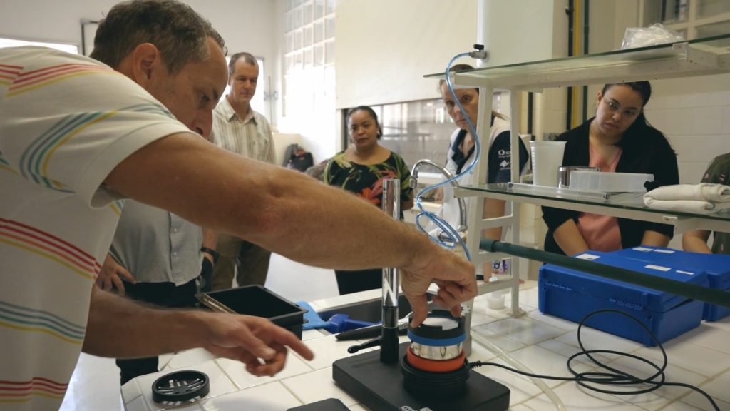 Medição da condutividade hidráulica saturada em amostra de solo no KSAT (Foto: Marta Otonni)