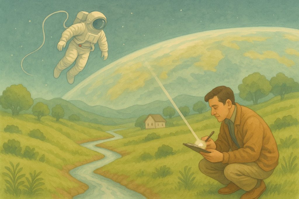 Astronauta sobrevoando e observando o planeta ao mesmo tempo que um observador realiza medições numa microbacia hidrográfica . Fonte: ChatGPT