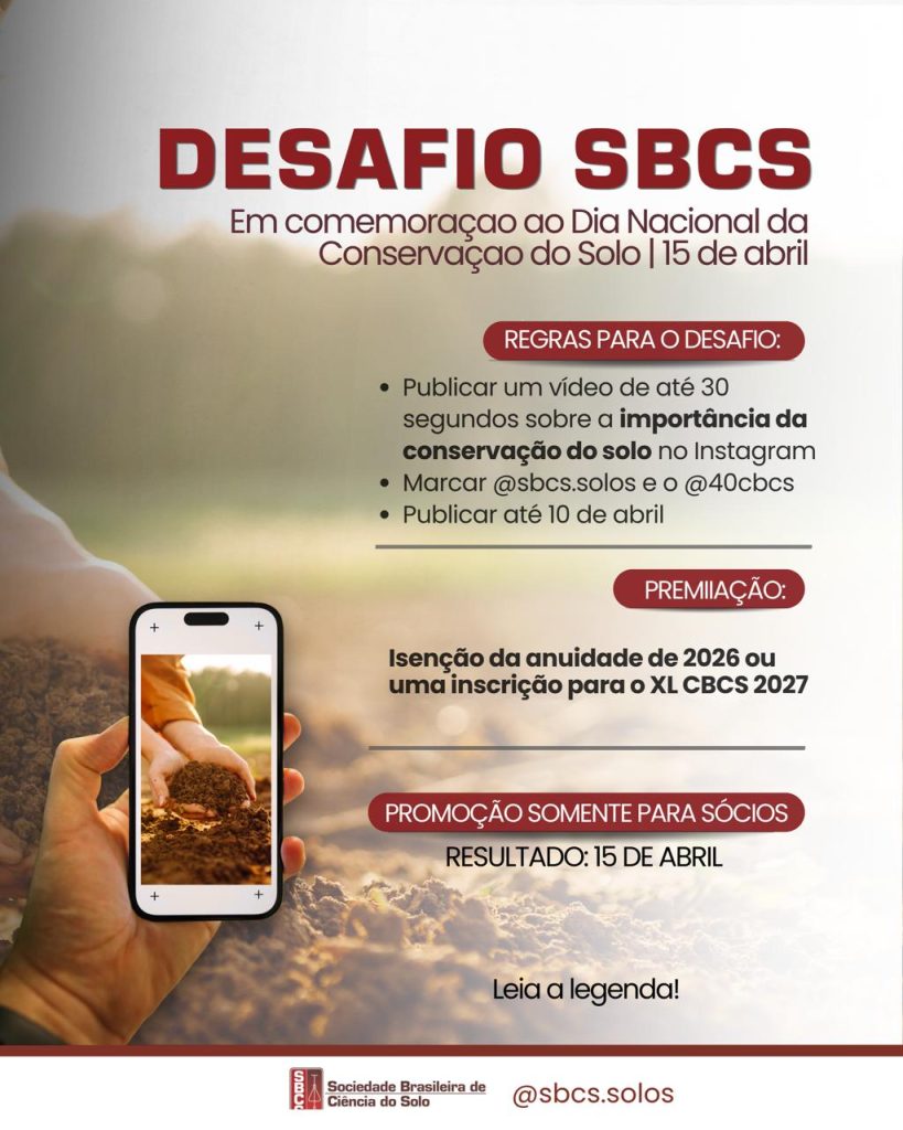 Em comemoração ao Dia Nacional da Conservação do Solo, 15 de abril, a SBCS convida todos os sócios a participarem do nosso desafio especial! 🎯