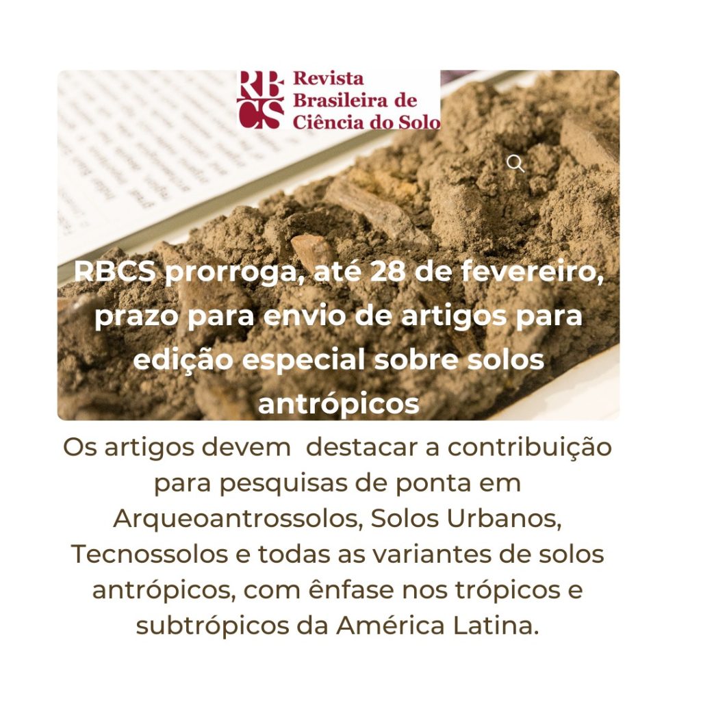 The Brazilian Journal of Soil Science (RBCS) has extended, until February 28, 2025, an induced call for articles for an edition that aims to present the state of the art of research on Archaeoanthrosols, Urban Soils, Technosols and all variants of anthropogenic soils, with an emphasis on tropical and subtropical Latin American regions.