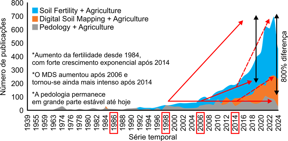 On the other hand, it is interesting to note that the arrival of pedometrics in the Brazilian context, starting in 2002, marks a turning point. From 2014 onwards, there has been a significant increase in publications involving digital soil mapping (DSM) and agriculture, precisely during the period when the adoption of geotechnologies and predictive algorithms intensified. Figure 1 highlights this leap, indicating that the incorporation of quantitative approaches has been serving as a driver of renewal in pedology, once again bringing it closer to contemporary challenges in agriculture and environmental sustainability.