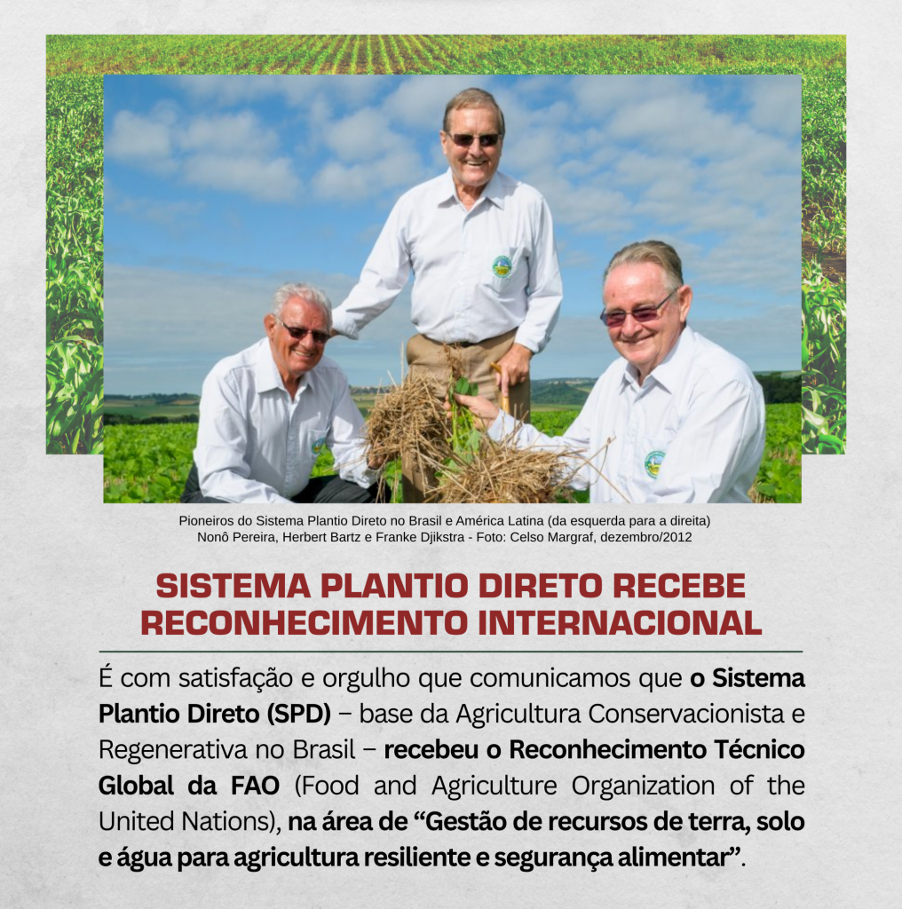 No-Till System receives international recognition We are proud and delighted to announce that the No-Till System (SPD) – the foundation of Conservation and Regenerative Agriculture in Brazil – has received Global Technical Recognition from the FAO (Food and Agriculture Organization of the United Nations) in the field of “Land, Soil, and Water Management for Resilient […]