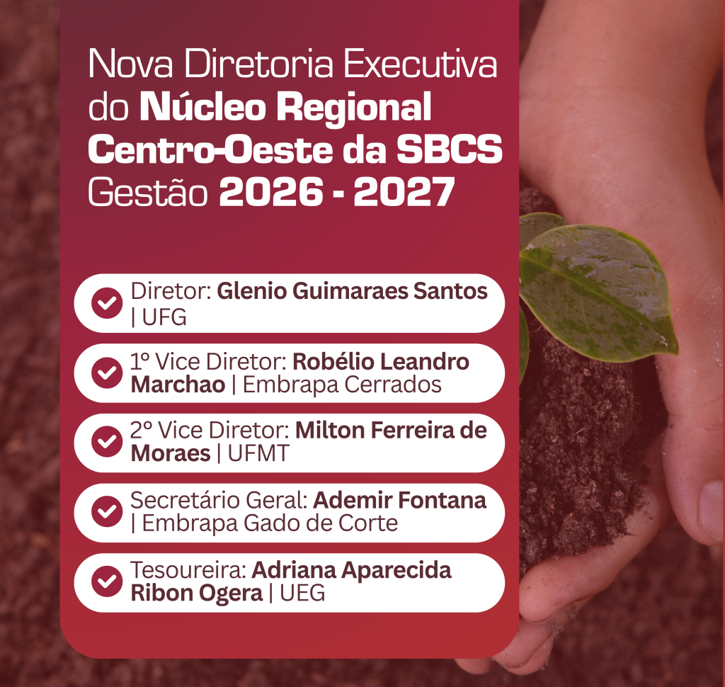 New Executive Board of the SBCS Central-West Regional Chapter – Term 2026-2027 The Brazilian Soil Science Society (SBCS) announces the new Executive Board of its Central-West Regional Chapter for the 2026-2027 term. The election was recently held, and the mandate will begin in January 2026. Meet the new board members: We congratulate the elected board […]